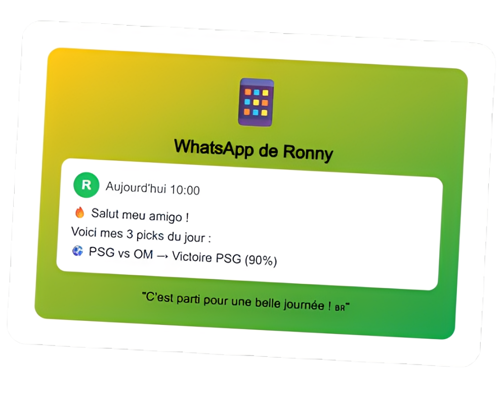 Chaque matin à 10h pile, tu reçois mes 3 meilleurs picks du jour directement sur WhatsApp. Prêt à parier ! 📱